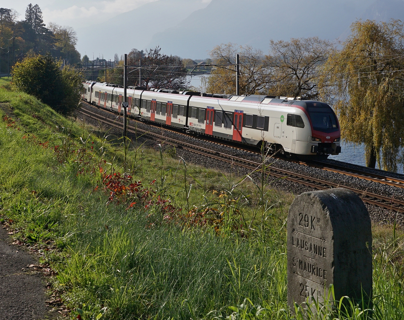 Der aus Aigle in Vallorbe eintreffende SBB Flirt RABe 523 027 und der abgestellte Flirt 3 RABe 523 103 bilden eine guten Vergleich der beiden verschiedenen Flirt-Bauarten.