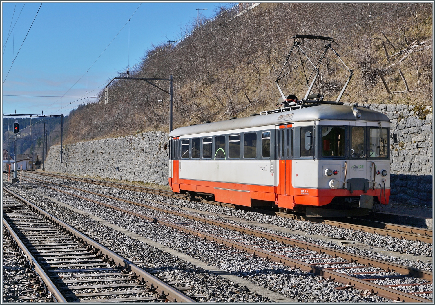 Der TRN (TansN, ex cmn) BDe 4/4 N° 3 wartet in Le Locle auf die Abfahrt als R 24 nach Les Brents. Eigentlich hätte die Strecke Ende 2023 noch gelegt werden sollen, doch wurden die am 24. Juli 23 entstandenen Unwetterschäden beseitigt und die Bahn soll nun doch noch bis 2031 weiterhin verkehren. Dabei ist anzumerken, dass die 1950 in Italien hergestellten BDe 4/4 3 und 5 nun schon seit 74 Jahren im Einsatz stehen! Gäbe es eine Steigerung von "Nachhaltigkeit" so würde sie wohl "BDe 4/4 N° 3" lauten...