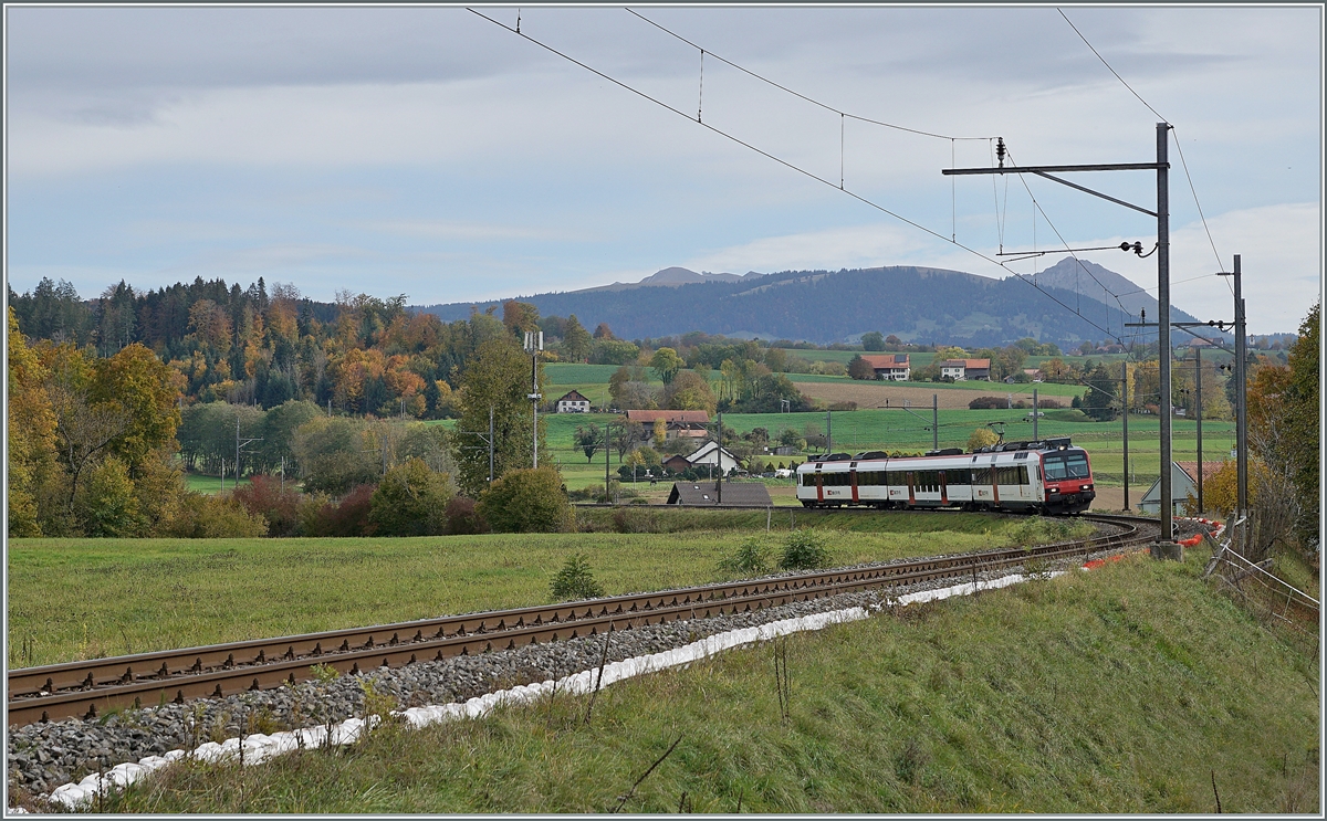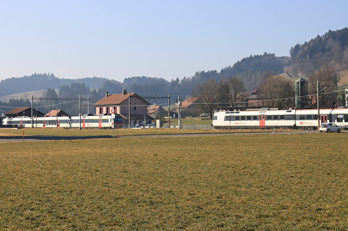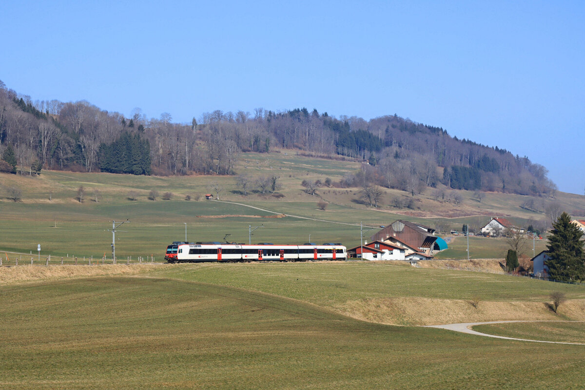 Der Broye entlang bei Moudon. Diese Begradigung des Flusses ermöglichte eine erhebliche Ausweitung der landwirtschaftlichen Nutzungsfläche und entstand im wesentlichen zwischen 1892 und 1906. Nebenher eine S8 Richtung Payerne, 10.März 2022