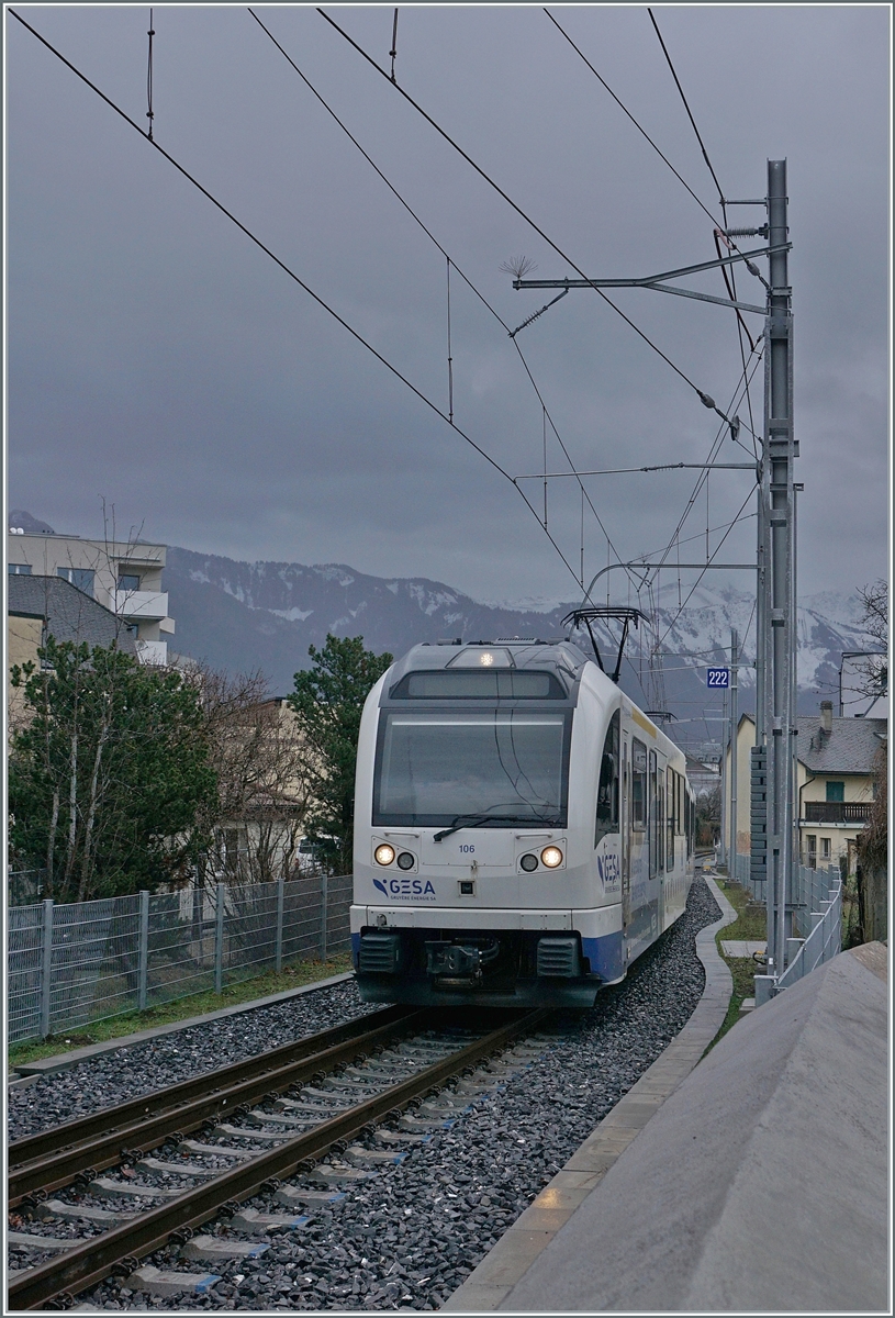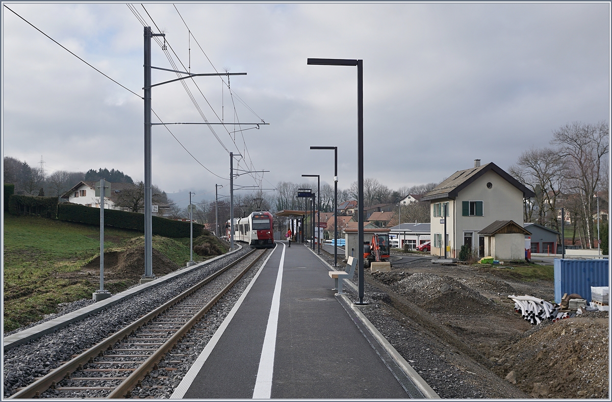 Der TPF Be 4/4 121 mit dem B 207 (ex MOB), B209 (ex MOB) und dem ABt 221 ist kurz nach Lessoc entlang des Stausees Lac de Lessoc als RER 51 nach Montbovon unterwegs.