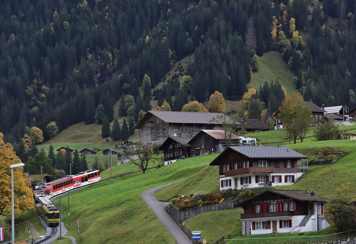Ein Zug der Wengernalpbahn WAB im Aufstieg von Grindelwald Grund. Zuvorderst Wagen 141 mit Vollwerbung für Coop, dahinter Wagen 147. 9.Oktober 2024