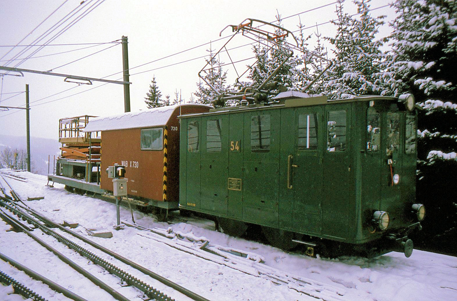 "Aus dem Leben der Wengernalpbahn Lok 54": Mit dem Fahrleitungs-Montagewagen X 730 in Wengen, auf dem alten Gleis, das direkt steil nach Lauterbrunnen führte. 30.Dezember 1996