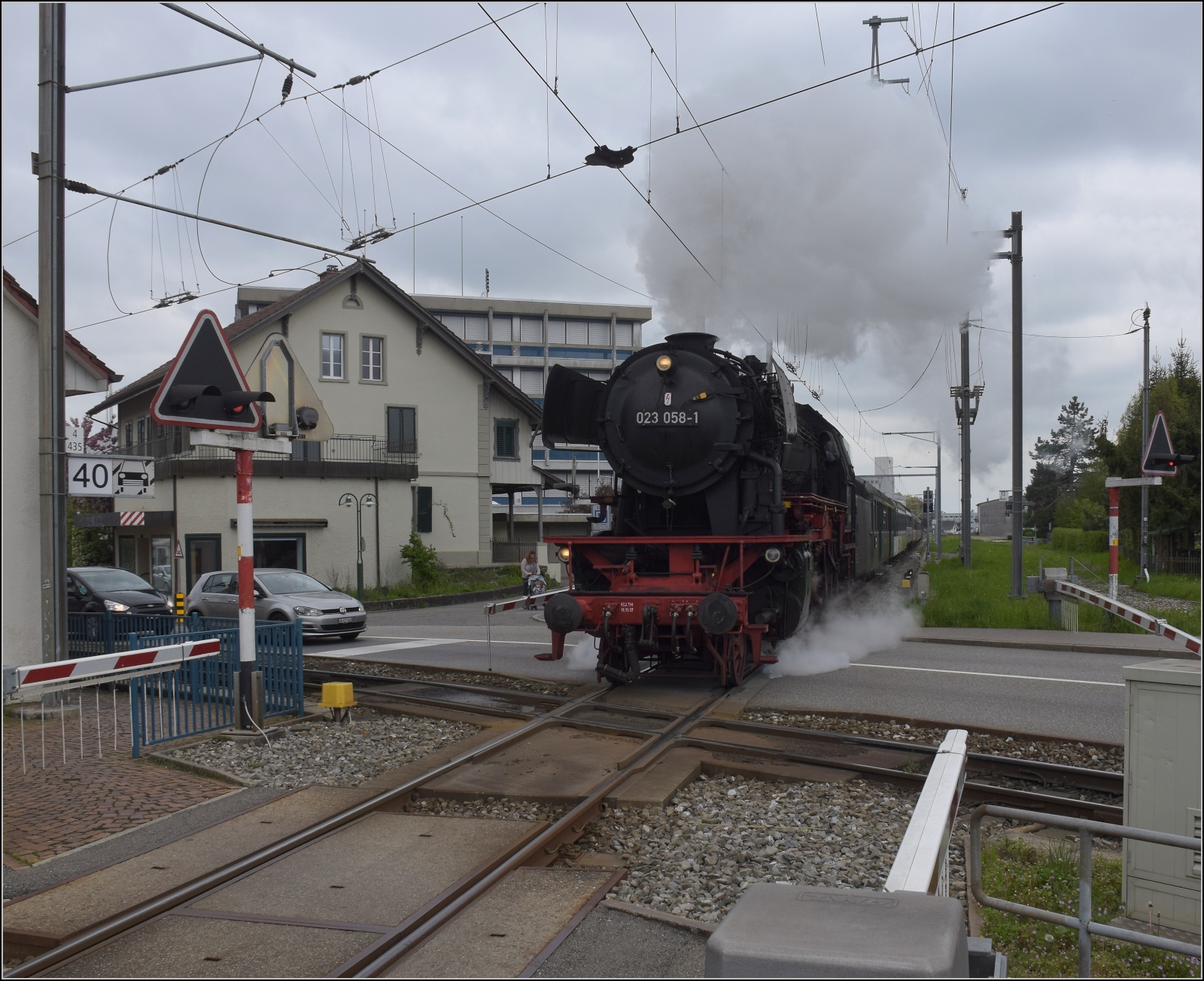 Nachdem der Zug der Suhrentalbahn gerkreuzt hat, erreicht 23 058 mit hoher Geschwindigkeit die Schienenkreuzung der Nationalbahn mit der Suhrentalbahn in Oberentfelden. April 2023.