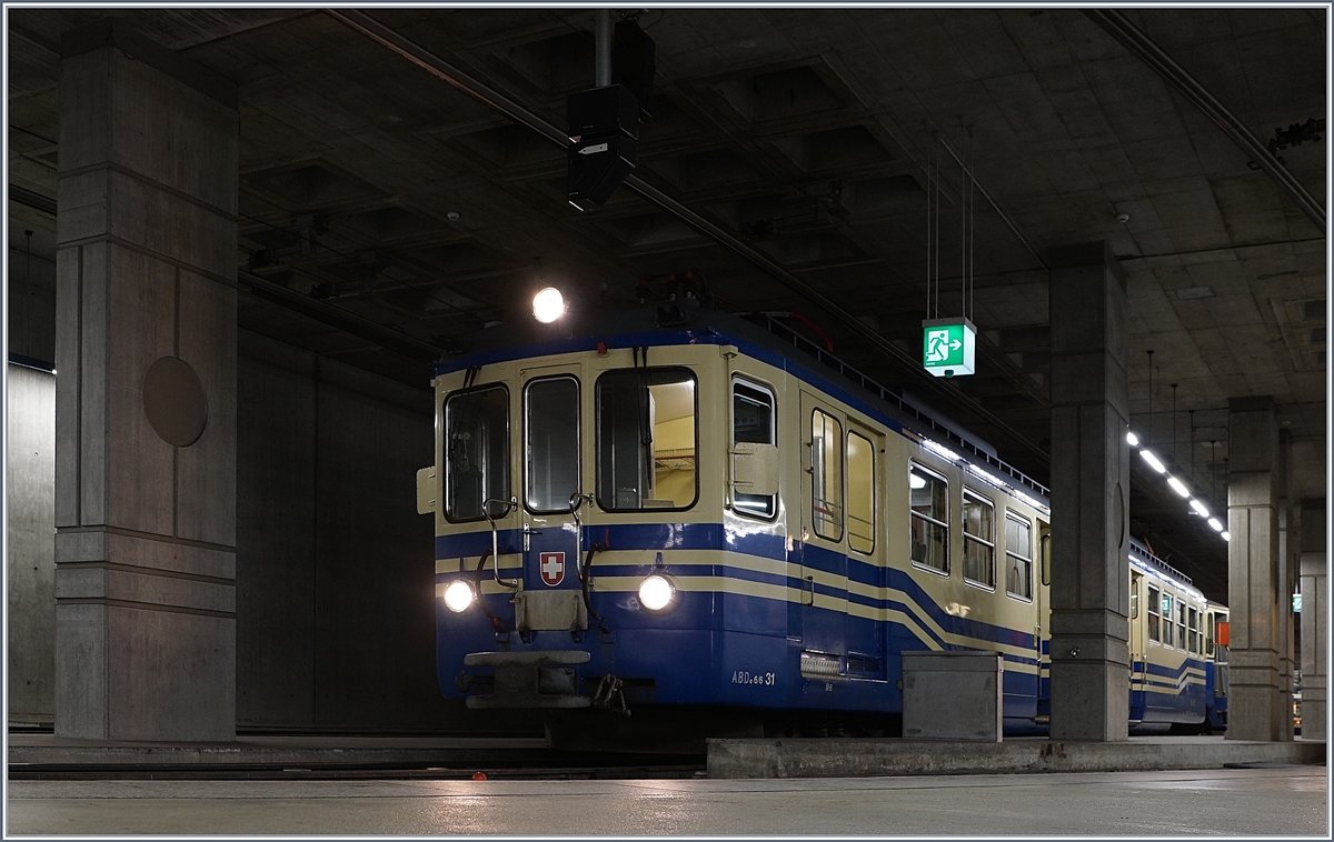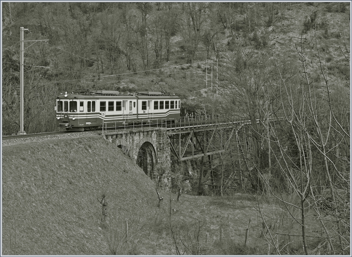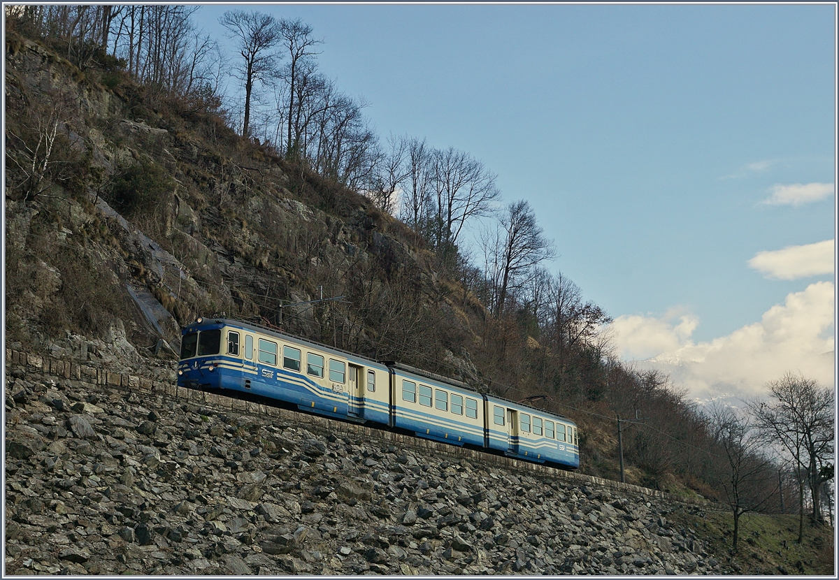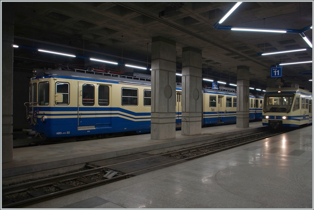 SSIF/FART: Zur Zeit der Einfahrt des "CENTOVALLI EXPRESSES" mit dem FART ABe 4/8 45 in den Bahnhof RE, waren in den Remisen 3 ältere blaue Triebzüge (ein ABe 4/6 sowie zwei ABe 8/8) stationiert. Die Aufnahme entstand am 2. Mai 2015.