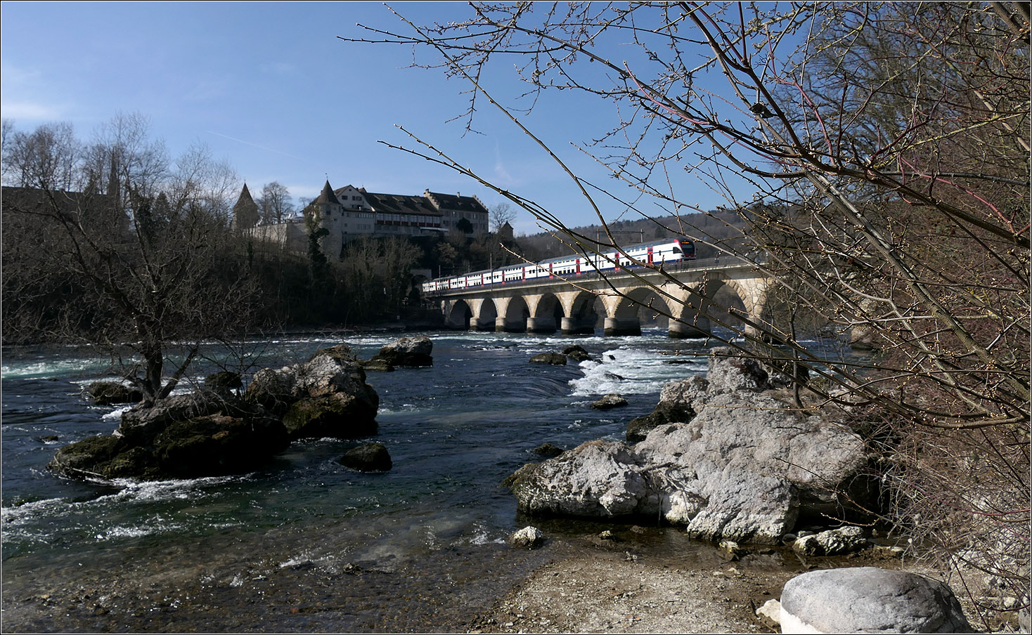 Den schönsten Blick auf den Rheinfall und Schloss Laufen hat man m. E. von dieser Fotostelle abseits des Touristentrubels, gut, wenn man mit einem "Einheimischen" unterwegs ist (Danke Olli!). Bei dieser Aussicht wird der RABe 514 zur Nebensache (02.08.2015).