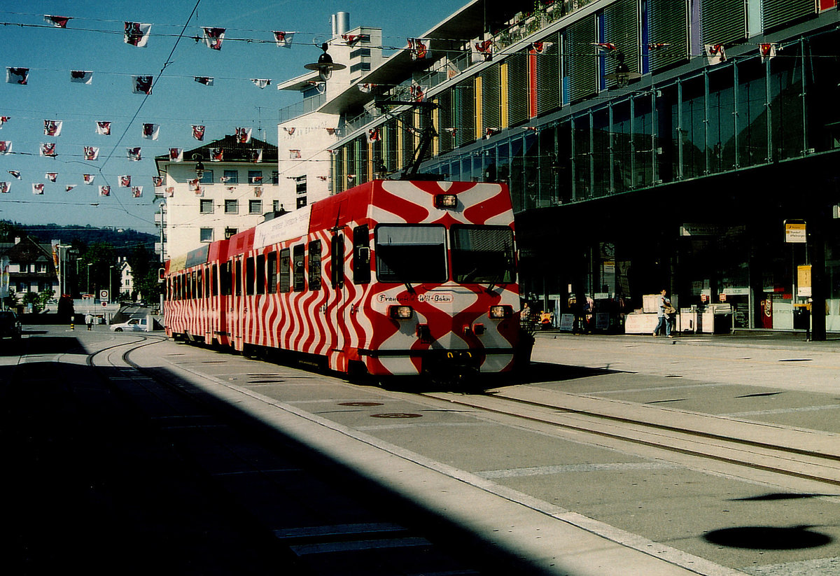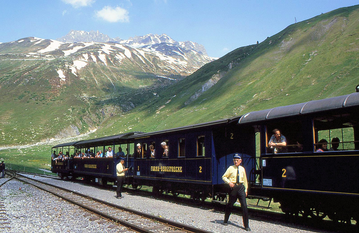 Dampfbahn Furka Bergstrecke: Damals fuhr der interessante kleine Wagen AB2 2420 auf der Strecke. Es handelt sich um einen zahnradlosen Wagen der Frauenfeld-Wil Bahn (BD2 22, dann B2 16) aus dem Jahr 1887, der im Jahr 2000 die Dampfbahn Furka Bergstrecke wieder verliess. 1.Juli 1995 Peter Ackermann