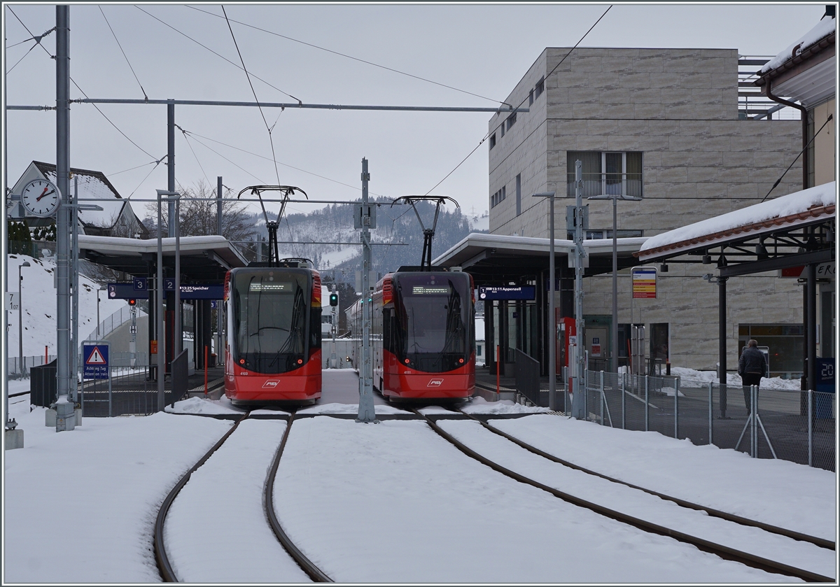 In Trogen stehen die beiden AB ABe 8/12 (Tango) 4103 und 4113; während der ABe 8/12 4103 hier wendet und nach Spicher (via St. Gallen) zurück fahren wird, ist er ABe 8/12 4113 auf dem Weg nach Appenzell.