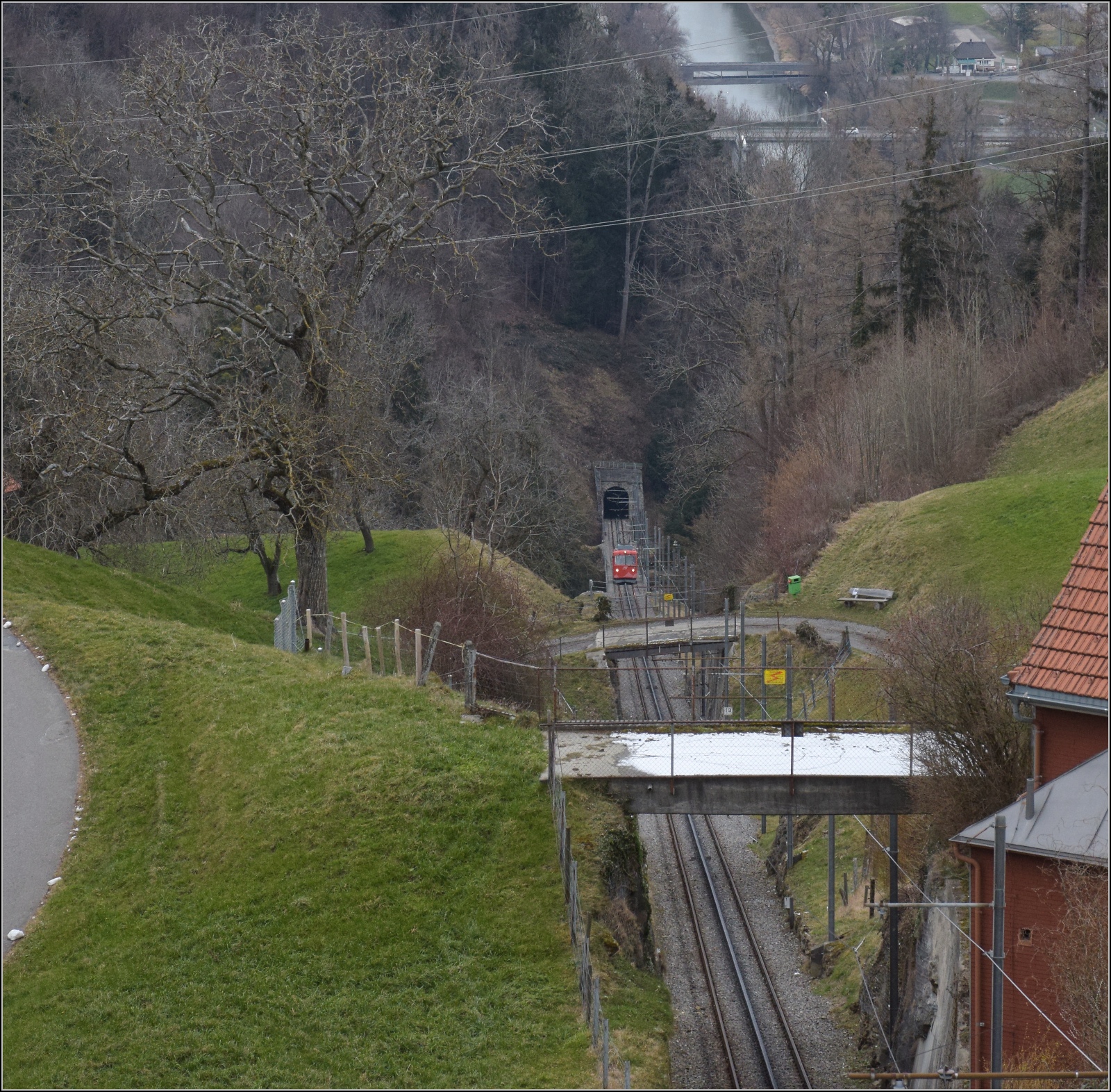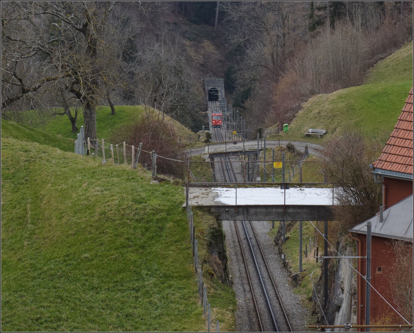 Der einzige Triebwagen BDe 1/2 der Rheineck-Walzenhausen Bahn unterhalb Walzenhausen. 27.Februar 2023
