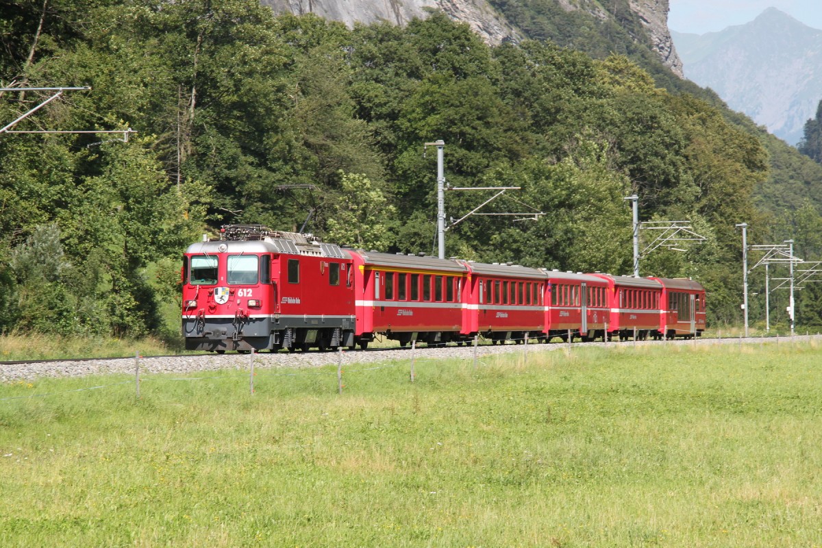 Jubiläum,125 Jahre RhB.Museumslok Ge6/6 I Nr.415(Krokodil)und Ge4/6 Nr.353 mit einem Pullmanzug nach Landquart,zwischen Grüsch und Malans.17.07.14 Peter Walter