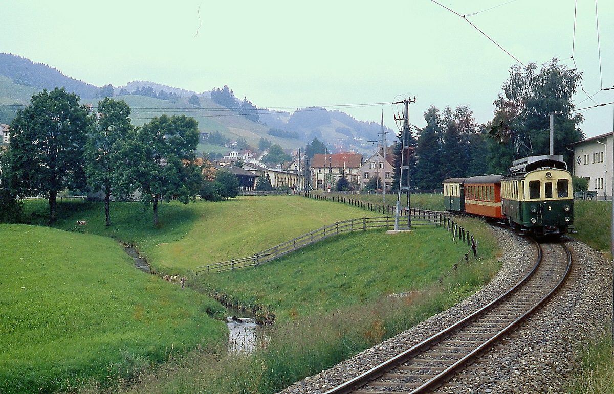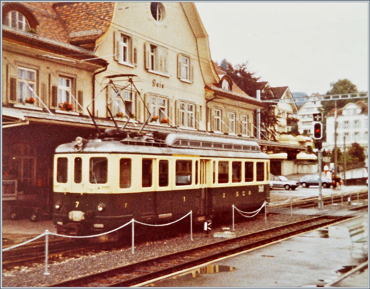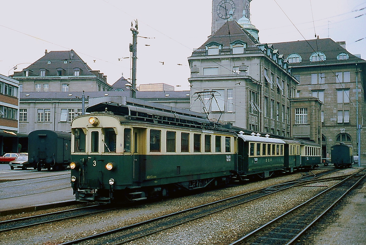 ABDeh 4/4 3 der SGA und ein BDe 4/8 der Trogener Bahn warten im Frühjahr 1979 im Bahnhof St. Gallen auf Fahrgäste