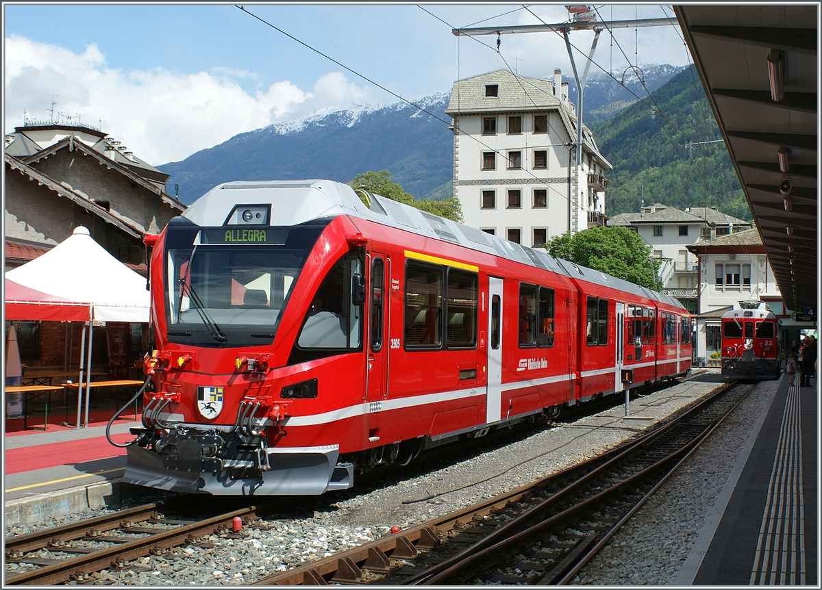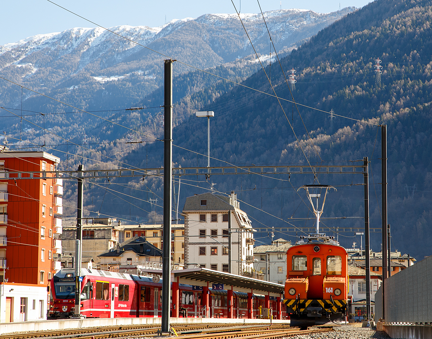 Rechts steht das RhB "Eselchen" 161 bzw. der Rangiertraktor RhB Ge 2/2 161, ex BB Ge 2/2 61. Hinten steht der 3-teilige RhB ALLEGRA-Zweispannungstriebzug (RhB ABe 8/12) 3515 "Alois Carigiet" mit 5 angehangenen Personenwagen zur Abfahrt als RhB Region nach St. Moritz bereit. Armin Schwarz
