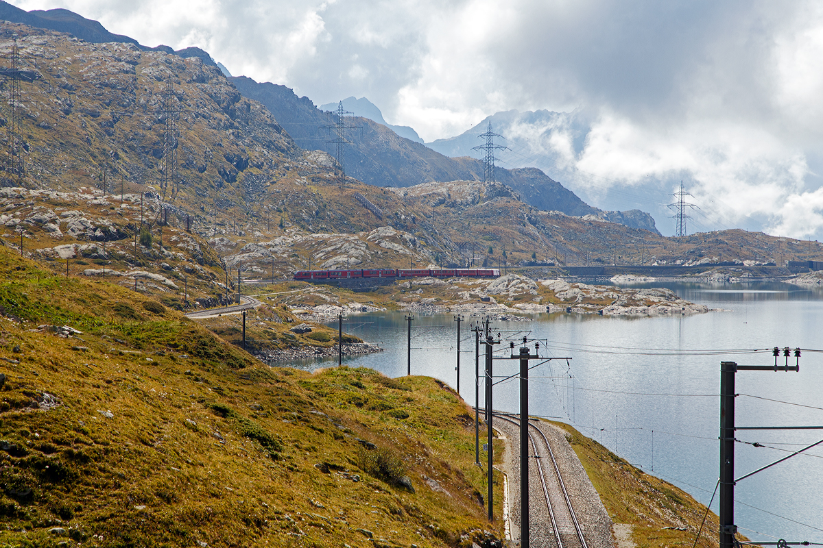 Geführt von dem RhB ALLEGRA-Zweispannungstriebzug ABe 8/12 – 3511 "Otto Barblan" erreicht der RhB-Regionalzug nach St. Moritz am 06.09.2021 bald, dem höchsten Punkt der Berninabahn, Ospizio Bernina. Armin Schwarz