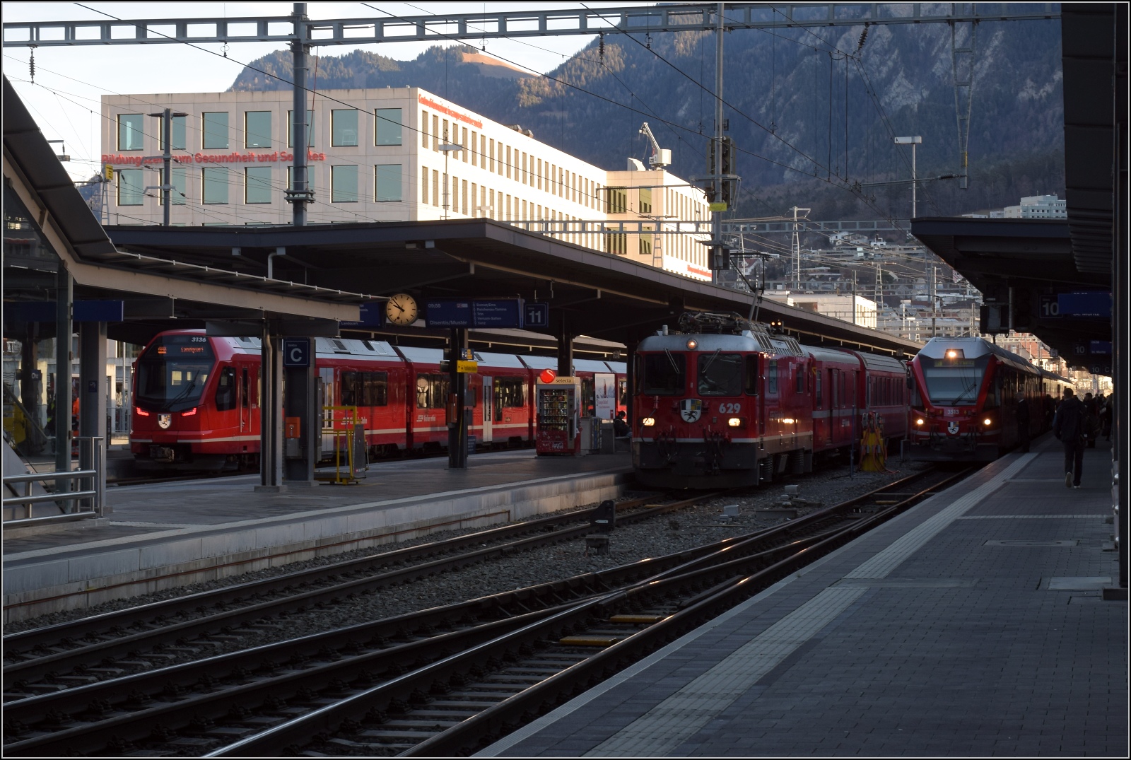 In Chur steht Capricorn ABe 4/16 3136 als Regionalzug nach Landquart parat. Daneben steht Ge 4/4 II 629 mit einem Zug ins Vorderrheintal bereit und rechts steht Allegra 8/12 3513 vor dem langen Interregio nach St. Moritz bereit. Januar 2023. Olli