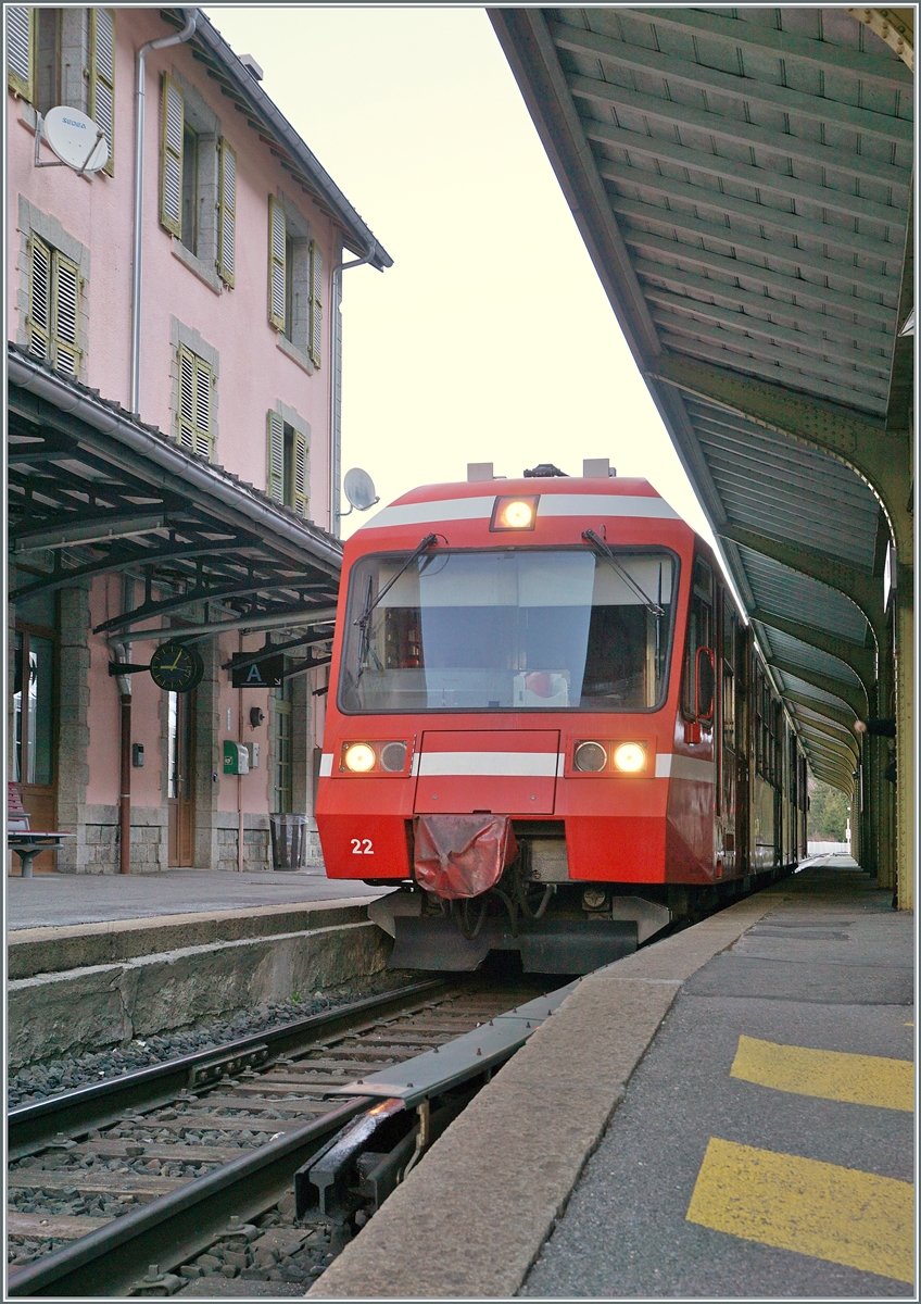 Ein TMR Beh 4/8 erreicht als Regionalzug von Martingy den Bahnhof von Vallorcine, während unter dem Bahnsteigdach im Schatten der TMR/SNCF BDeh 4/8 21 als Anschlusszug nach St-Germain-les Bains-le-Fayette steht.