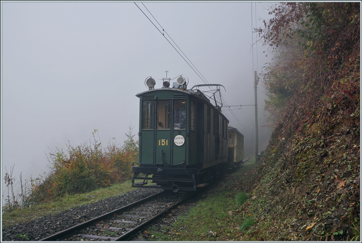 La DER de la Saison / Das Saison Ende der Blonay Chamby Bahn 2025 - Seit einigen Jahren zeigt die Blonay Chamby Bahn zum Saison Ende mit einem verdichteten Fahrplan noch einmal ihre herrlichen Fahrzeuge im Einsatz: Viel Verkehr in Chamby auf Gleis 3 warte der CGTE Fe 4/4 151 auf Anschlussreisende der MOB und auf den beiden MOB Gleisen kreuzen sich zwei MOB PE30 Regionalzüge Zweisimmen - Montreux, resp Montreux - Zweisimmen.