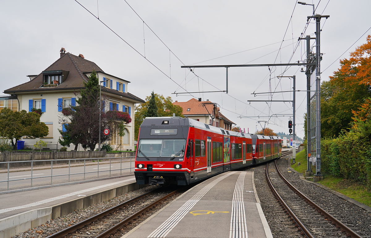 Kurz nach Verlassen des Bahnhofs Ins Dorf fahren die Be 2/6 510 und 503 am 11.10.2025 am ehemaligen BTI-Triebwagen BDe 4/4 5, später BRe 4/4 516 und heute Restaurant  Ankerstube , vorbei