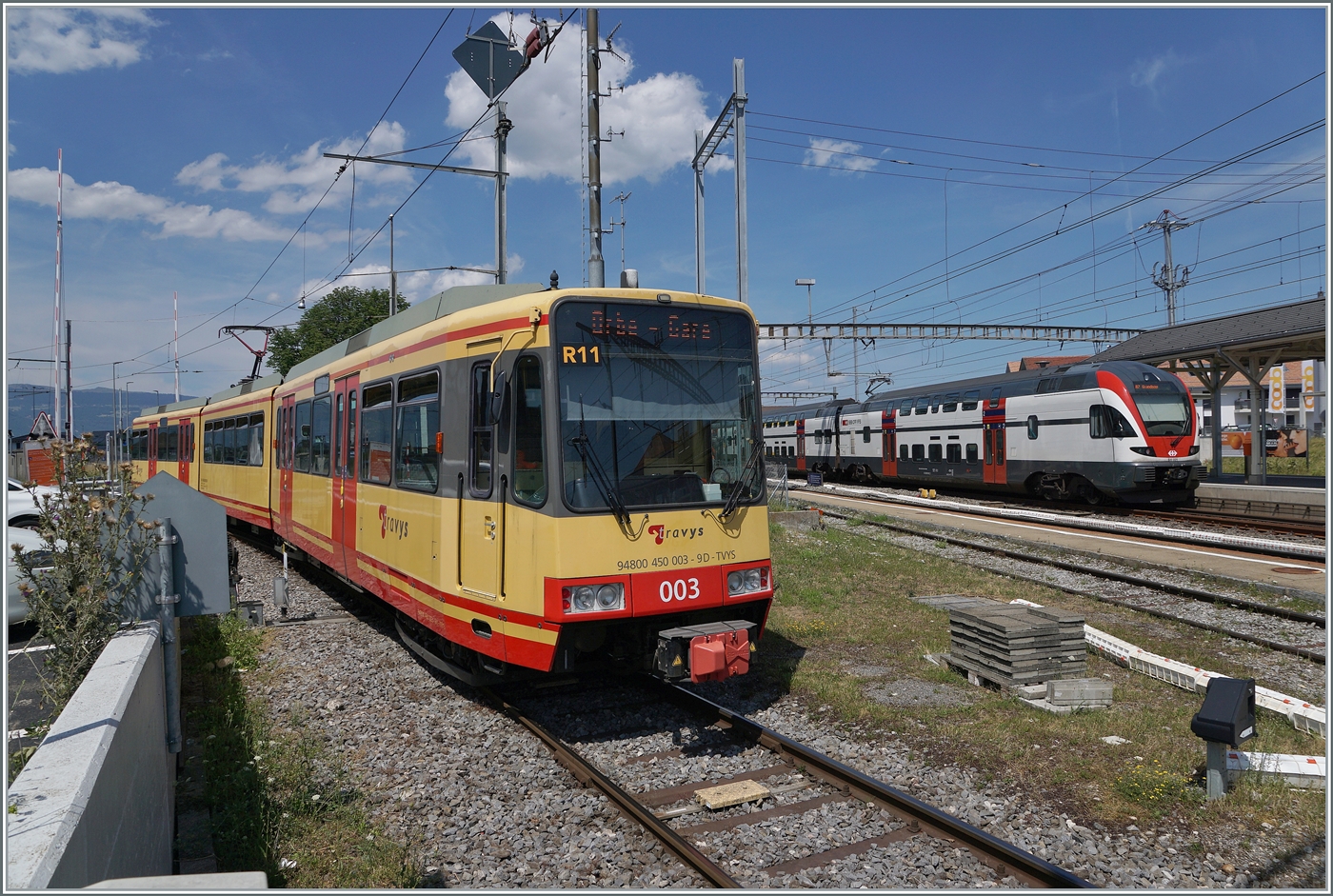 Der RABDe 511 111 als RE 2719 von Genève nach Vevey fährt in Lonay-Preveranges ohne Halt durch. Die Haupt und Vorsignale 4X und 4W werden in Bälde durch neuen Signale im Hintergrund ersetzt.