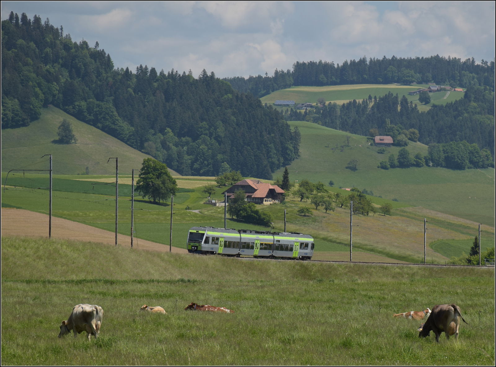 150 Jahre Emmentalbahn. Die Rampe von Konolfingen nach Grosshöchstetten (im Hintergrund) fährt nach dem mittlerweile historischen NPZ noch eine dreiteilige Nina RABe 525 hinunter, vermutlich RABe 525 008. Konolfingen Dorf, Mai 2025.