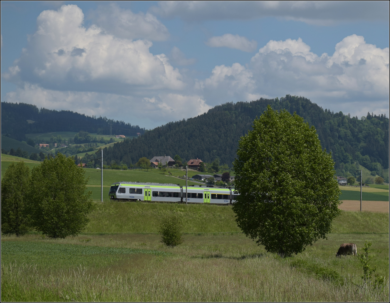Die Rampe von Konolfingen nach Grosshöchstetten (im Hintergrund) fährt nach dem mittlerweile historischen NPZ noch eine dreiteilige Nina RABe 525 hinunter, vermutlich RABe 525 008. Konolfingen Dorf, Mai 2025.