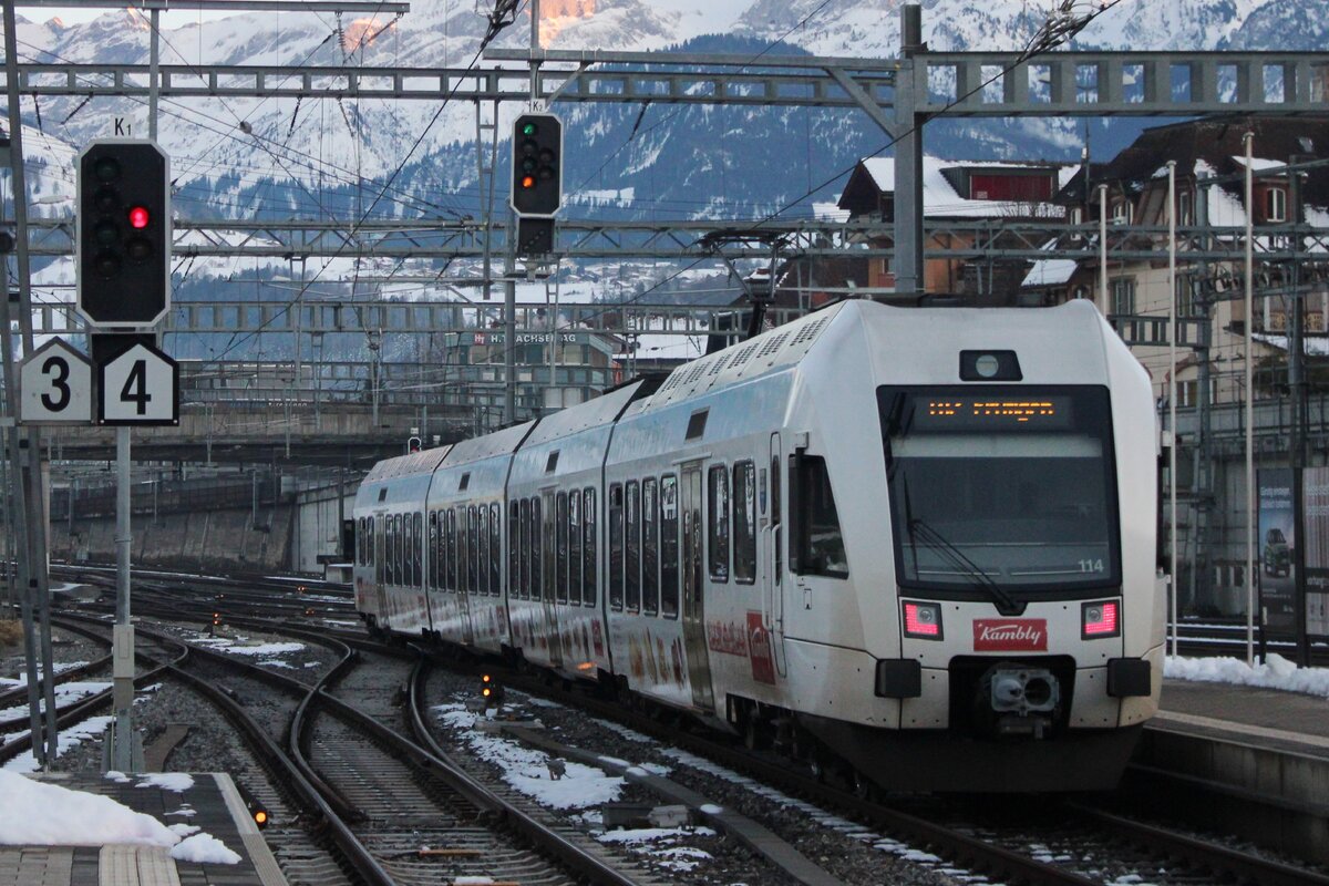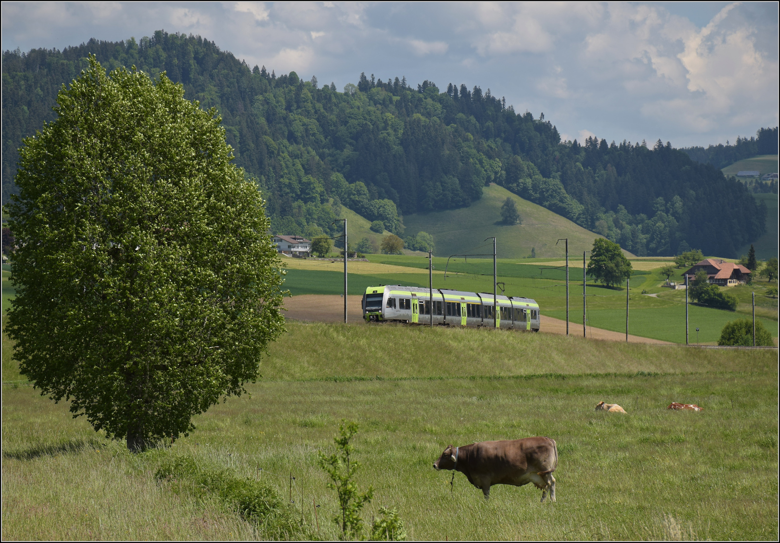 Eng verwoben mit der Emmentalbahn (EB) war die Burgdorf-Thun-Bahn (BTB) ab ihrem Betriebsstart. Seit ihren ersten Tagen 1899 war die Elektrifizierung mit Drehstrom die grosse Besonderheit dieser Bahn. Dadurch war auch die Rampe von Konolfingen nach Grosshöchstetten (im Hintergrund) als grösseres Betriebshindernis für die Bahn besser im Griff. Im ersten Weltkrieg profitierte die Bahn von von der Energiekriese aufgrund ihrer nachhaltigen Energieversorgung. Der Strom wurde 1932/33 auf Einphasen-Wechselstrom umgestellt, aber das Prinzip des Drehstromantriebs beherzigt heute der Lötschberger Kollege RABe 535 121 intern, hier auf dem Weg nach Grosshöchstetten hinauf. 1942 wurde die BTB mit der EB zur Emmental-Burgdorf-Thun-Bahn (EBT) fusioniert, 1997 folgte der Zusammenschluss mit VHB und SMB zum Regionalverkehr Mittelland (RM), der wiederum 2006 in die BLS integriert wurde. Konolfingen Dorf, Mai 2025. Olli