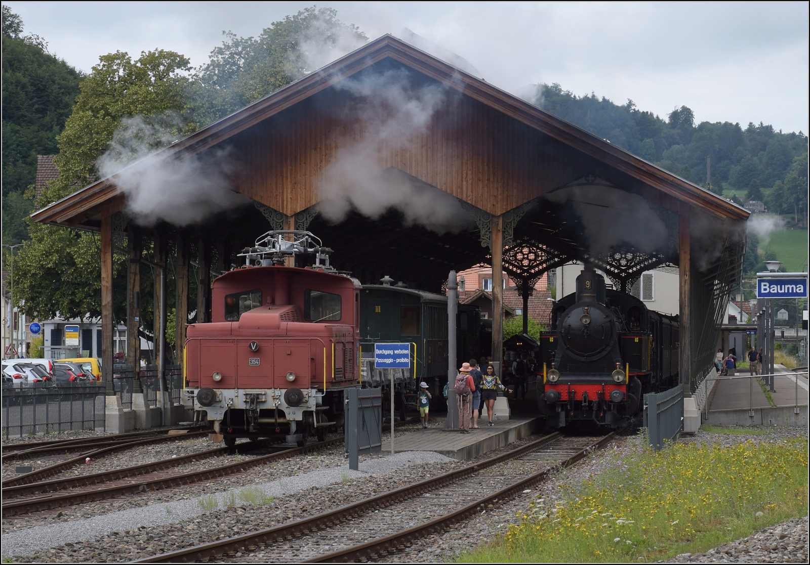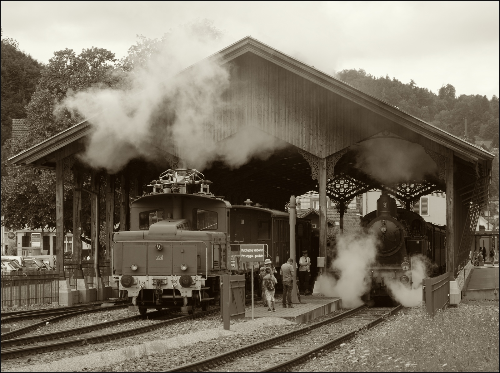 Abfahrt der Eb 3/5 9 der Bodensee-Toggenburg-Bahn mit ihrem wunderbaren Personenzug von Neuthal. Juli 2020. Die Fotowolke hat unmittelbar vor Abfahrt der Sonne Platz gemacht. Der Fotograf nicht. Bei dem aber lässt sich was machen...